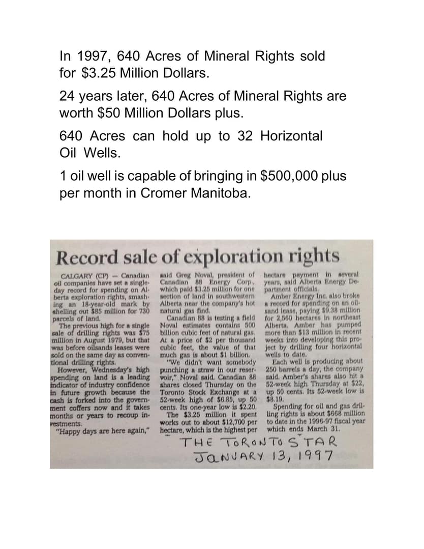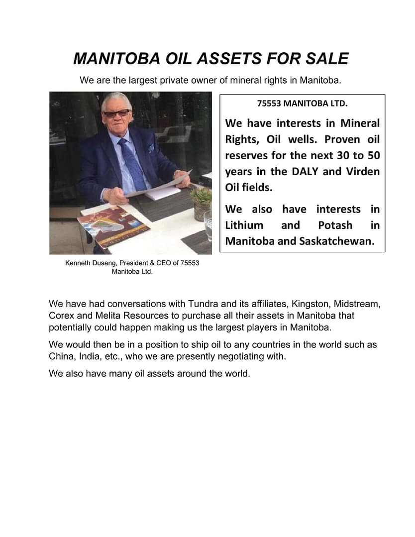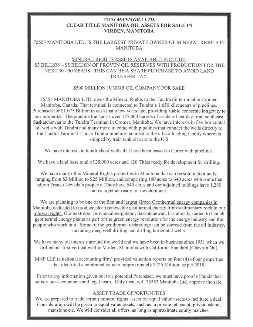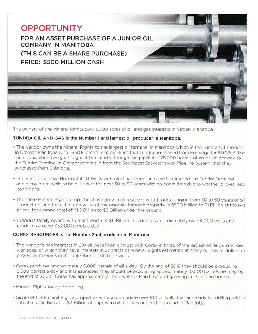 We have $3 billion dollars of proven oil reserves under the ground and thousands of acres ready for development. We will consider accepting gold, bitcoin, and other cryptocurrencies as a part of our sale price.